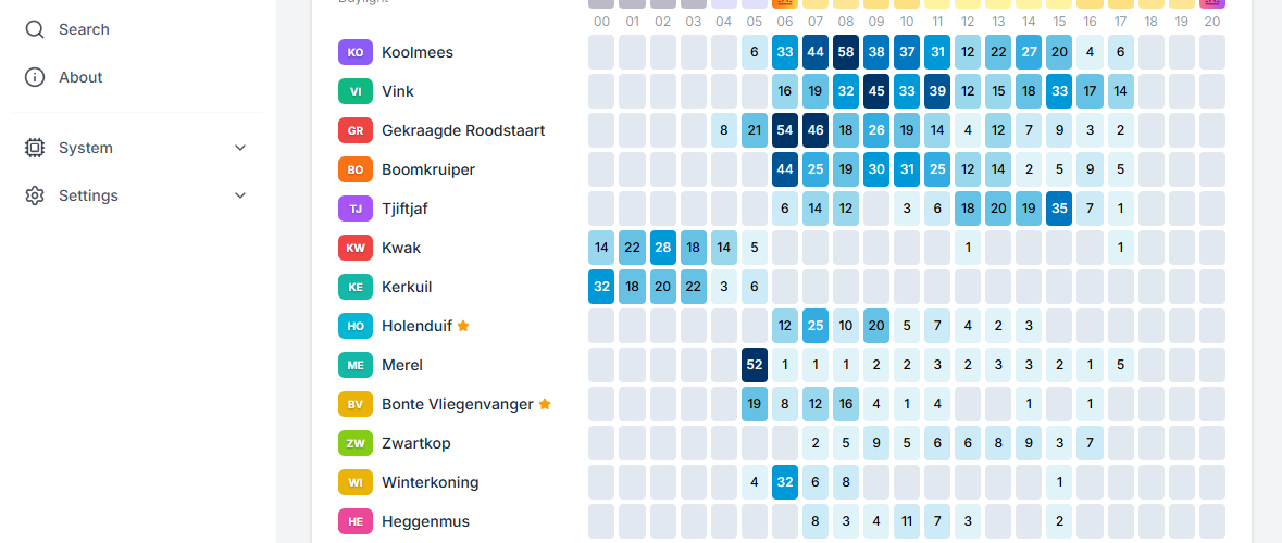 En ineens had ik een dashboard. Gewoon data. Grafiekjes. Frequenties. Alsof ik een KPI-set had voor mijn achtertuin. Je gaat er bijna targets aan hangen. “Vandaag minimaal drie nieuwe soorten, anders escaleren we.”